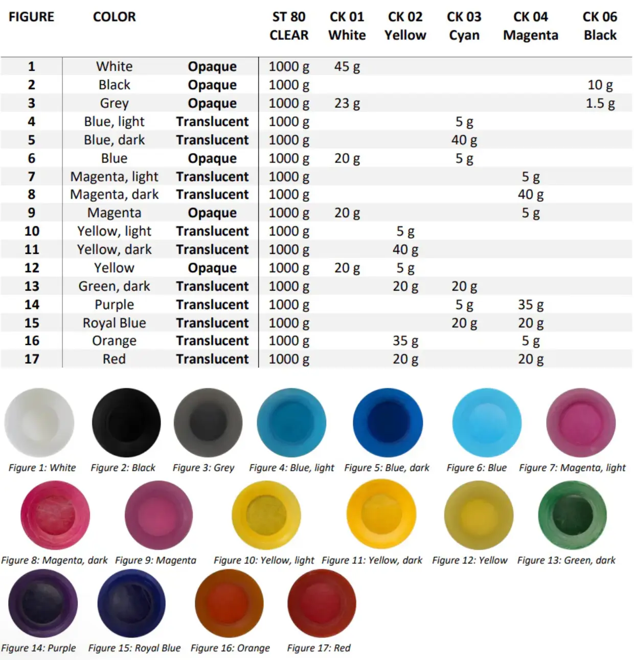 - Le tableau utilise des ratios basés sur le poids. Cependant, les mêmes ratios peuvent être utilisés sur une base de volume (par exemple, en utilisant une seringue pour ajouter un kit de couleur). Les densités liquides des ColorKit ainsi que de la plupart des résines disponibles sont toutes très similaires (environ 1,0-1,1 g/ml), les effets sur la couleur finale seront négligeables.