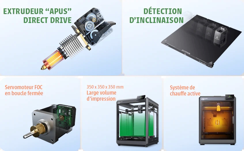 L’extrudeuse ainsi que les axes XYZ de la K2 Plus sont entraînés par des servomoteurs en boucle fermée, assurant une précision et une fiabilité remarquables. Grâce à leurs 32 768 micro-pas par tour, ces moteurs offrent un couple élevé et une réactivité exceptionnelle, même lors d’impressions complexes à haute vitesse.