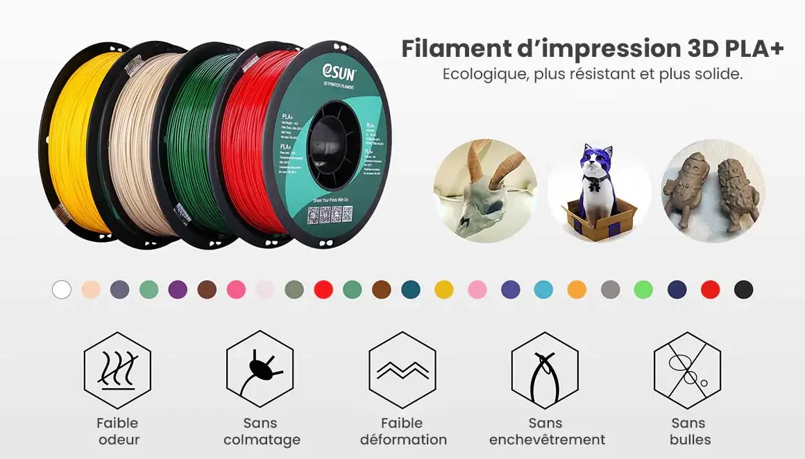 Le PLA+ est un matériau respectueux de l'environnement, facile à imprimer et présente une surface lisse. Il dispose d'une bonne solidité, d'une grande rigidité, d'une forte résistance à l'impact et est très approprié pour l'impression de pièces fonctionnelles. Il est également approuvé par la FDA et est donc sûr à utiliser. Il est couramment employé pour imrimer modèles conceptuels, prototypes rapides...