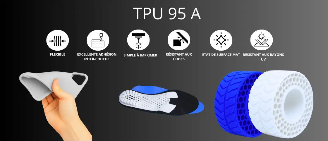 Ce filament présente une dureté de 95 Shore A, ce qui lui confère une flexibilité remarquable, éliminant ainsi le besoin de modifier les paramètres de remplissage ou de couche pour obtenir des performances optimales. Composé de polyuréthane, il offre une excellente réduction des vibrations, améliorant ainsi la stabilité de l'impression.