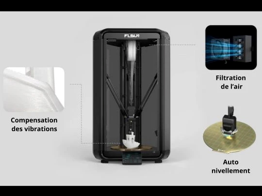 La FLsun T1 intègre un système de nivellement automatique, un compensateur de vibrations, ainsi qu’une filtration d’air combinant filtre HEPA et charbon actif. Elle détecte également la casse de filament et peut reprendre l’impression après une coupure de courant, pour une expérience sans interruption.