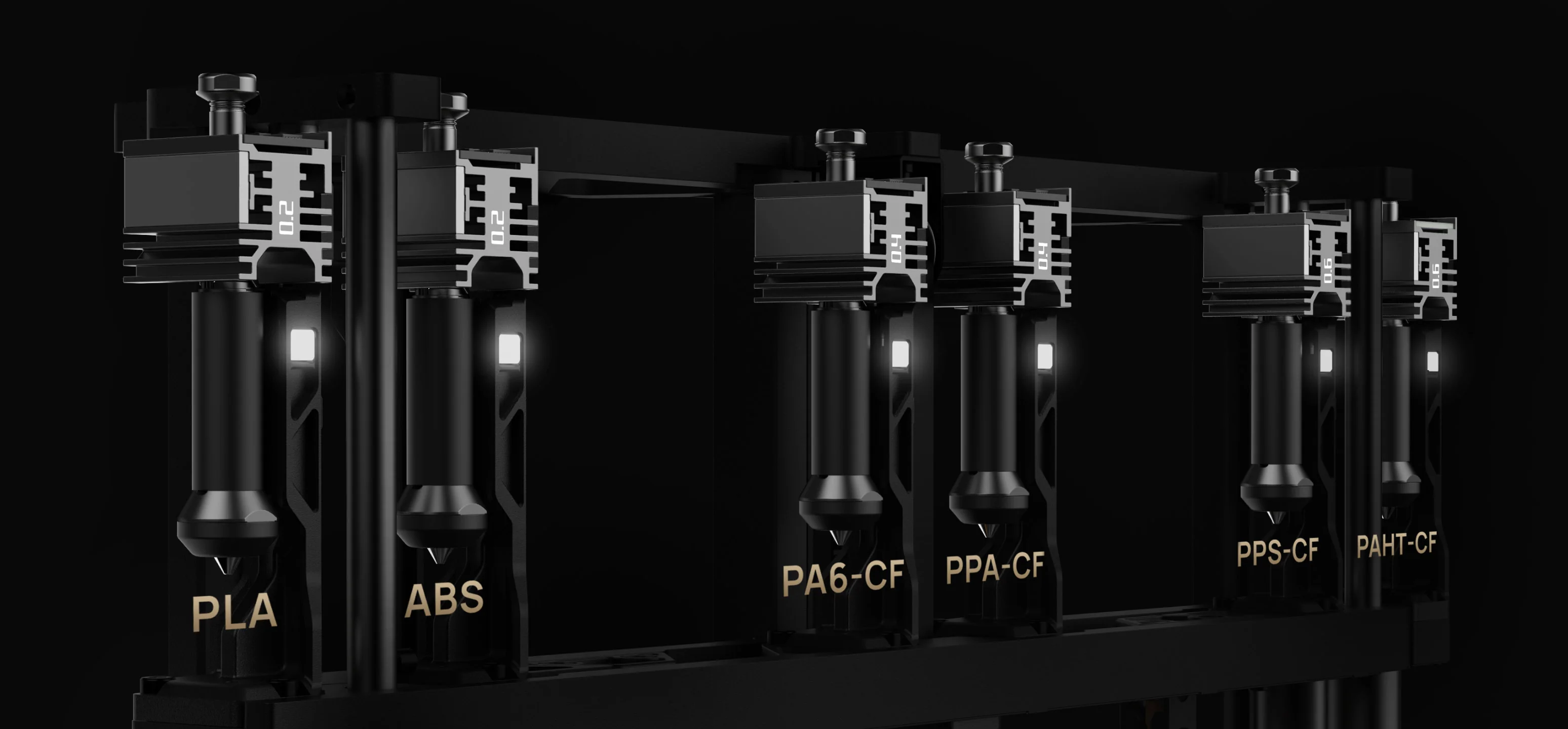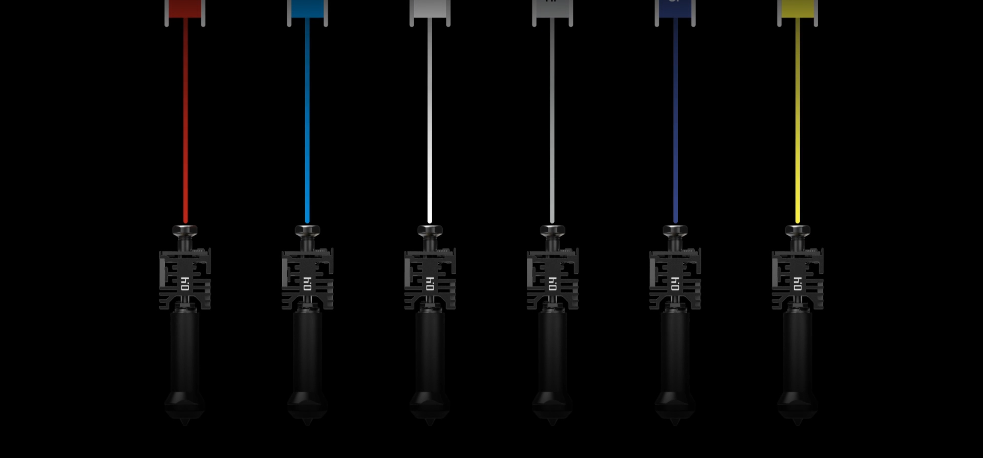 Comme seul la hotend est échangé, le système peut accueillir jusqu’à 6 hotends interchangeables sans réduire significativement le volume d’impression. Cela signifie plus de matériaux, plus de couleurs et plus de possibilités, le tout en une seule impression.