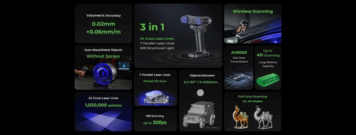 En combinant des lignes laser bleues à une lumière structurée infrarouge, le Raptor X est capable de numériser des objets allant de 5 × 5 × 5 mm³ jusqu’à 4000 × 4000 × 4000 mm³. Il permet de scanner avec une grande facilité des pièces d’ingénierie, des moules, des composants automobiles, des corps humains, et bien plus encore.​
